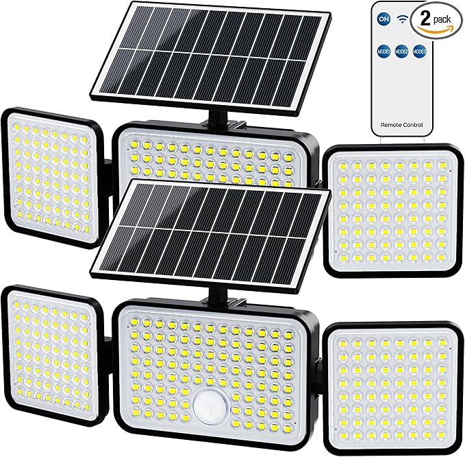 JIXIN Luces solares para exterior, 304 LED 8500K sensor de movimiento luz exterior, 4 cabezales ajustables 3 modos luces de inundación solares, IP65 impermeable LED luces de seguridad para patio pared